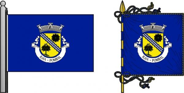 Armas - Escudo de ouro, banda ondada de azul e prata de cinco tiras, entre capacho de verde e pinheiro arrancado e frutado do mesmo. Coroa mural de prata de três torres. Listel branco com a legenda a negro: “ ILHA - POMBAL “.
